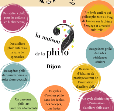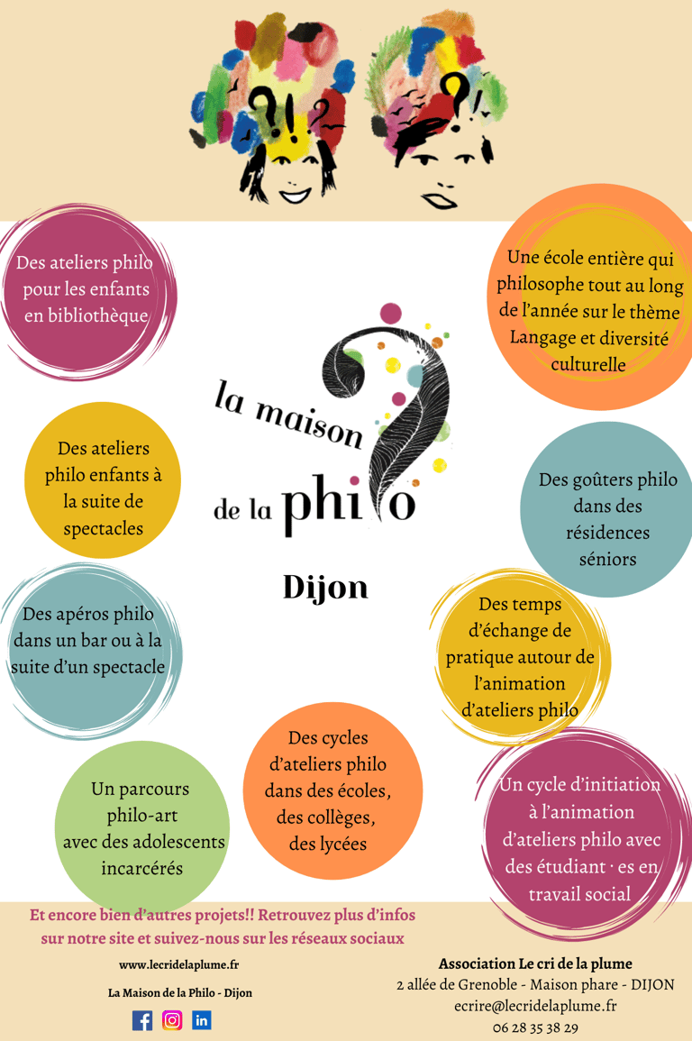 L'association Le cri de la plume, officiant depuis plus de 12 ans à Dijon, porte désormais le projet de Maison de la Philo ! Depuis 2020, les membres de l'équipe animent des ateliers en ville mais aussi aux alentours, pour des publics variés : les enfants, les ados, les adultes et les séniors, chacun a droit à des moments de philosophie partagés !